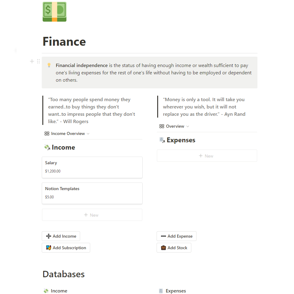 If you're looking to effectively manage your finances, then look no further than the "Finances" Notion Template". This powerful tool is designed to help you keep track of your income, expenses, investments, and more, all in one convenient location. With this template, you can easily create a budget that works for you, track your spending, and set financial goals for the future. It also allows you to view all your financial data in one place, making it easy to see where your money is going and identify areas where you can cut back. The "Finances" Notion Template is highly customizable, so you can tailor it to meet your specific needs. Whether you're a freelancer, small business owner, or simply looking to get a better handle on your personal finances, this template is the perfect solution. So if you're ready to take control of your finances and start making smart financial decisions, then get the "Finances" Notion Template today!